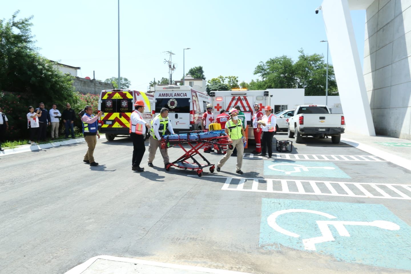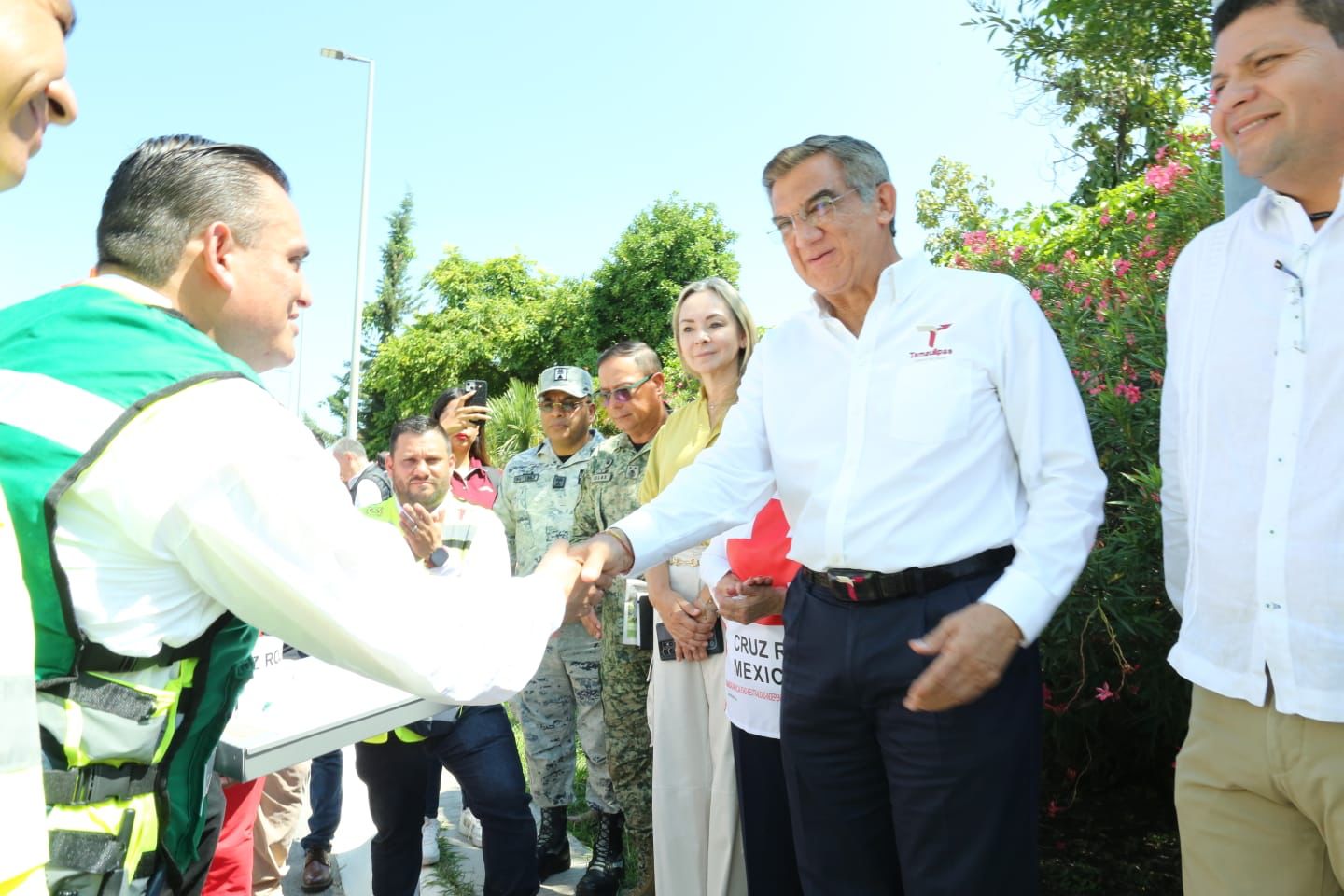 En este simulacro acompañaron al gobernador el coordinador estatal de Protección Civil, Luis Gerardo González de la Fuente; la delegada estatal de la Cruz Roja en Tamaulipas, Graciela Guerra de Araujo; el secretario general de Gobierno, Héctor Joel Villegas González; el secretario de Seguridad Pública, Sergio Chávez García; y el secretario ejecutivo del Sistema Estatal de Seguridad Pública, Jorge Cuéllar Montoya.
