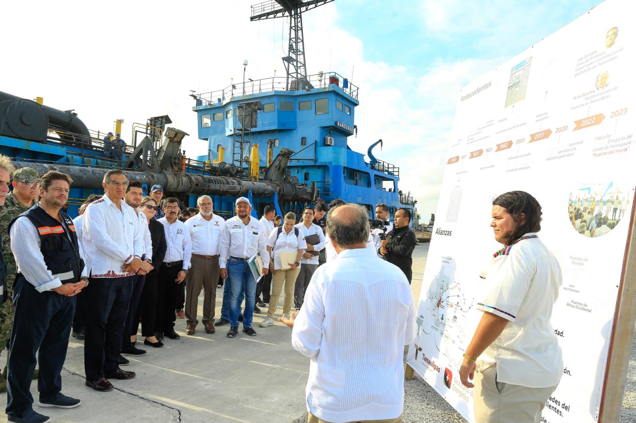 En este recorrido y al pie de las dragas Montebello y Banderas, de la Secretaría de Marina, el director general de la Administración Portuaria Integral de Tamaulipas (API), Gustavo Guzmán Fernández, presentó una amplia explicación de los avances, planes de desarrollo y los retos que enfrenta el Puerto del Norte, un proyecto histórico que hoy se ha cristalizado gracias a la visión del gobernador Américo Villarreal.