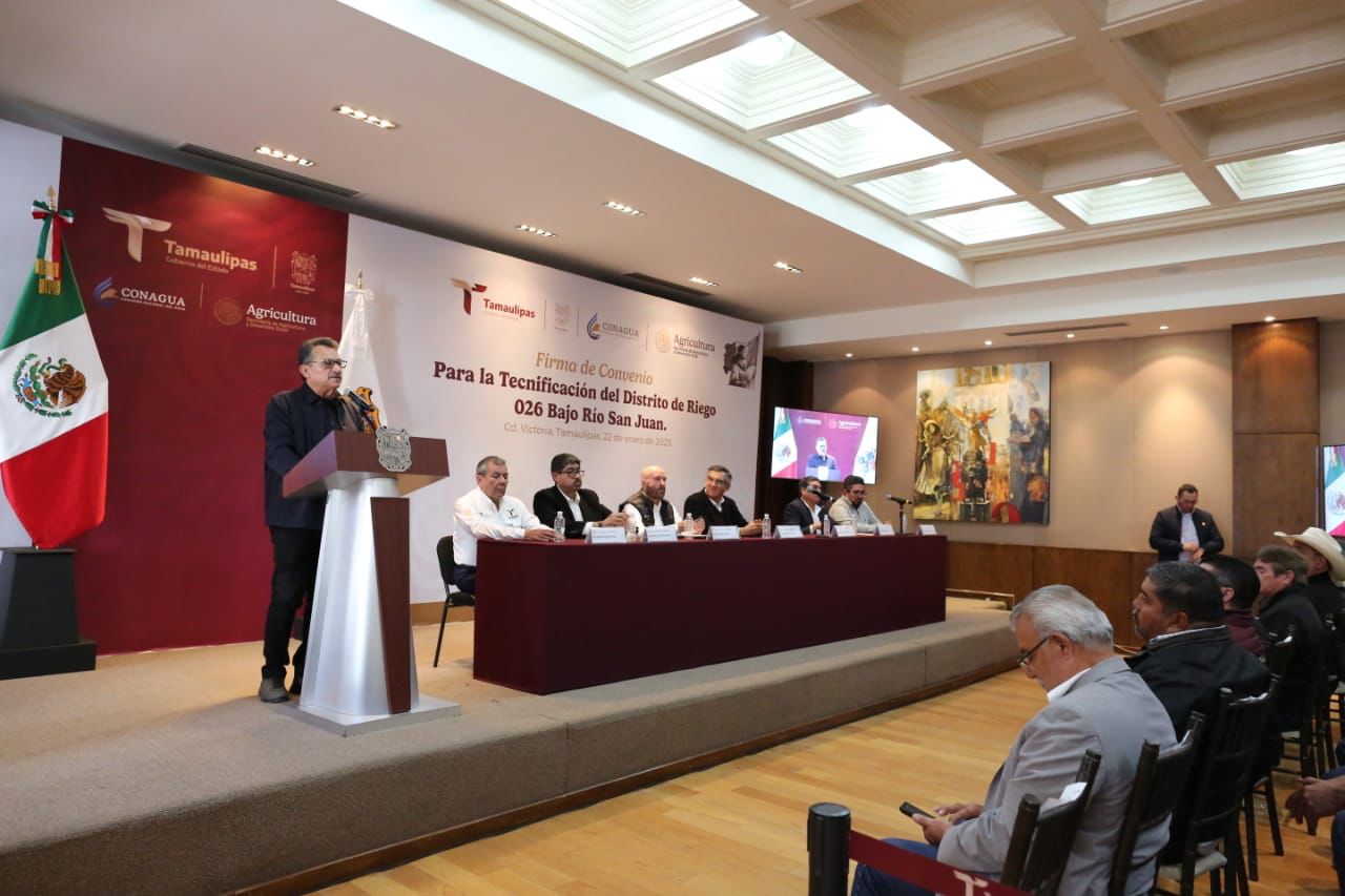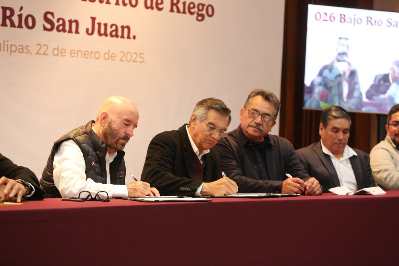 Como parte del Plan Nacional Hídrico que impulsa la presidenta Claudia Sheinbaum, el gobernador Américo Villarreal Anaya firmó un convenio de colaboración entre la Comisión Nacional del Agua (CONAGUA), el Estado a través de la Secretaría de Recursos Hidráulicos de Tamaulipas, la Secretaría de Agricultura y Desarrollo Rural y los usuarios del Distrito de Riego 026 Bajo Río San Juan, que permitirá tecnificar 200 kilómetros de canales en el fronterizo Distrito de Riego con una inversión de más de 4,100 millones de pesos.
