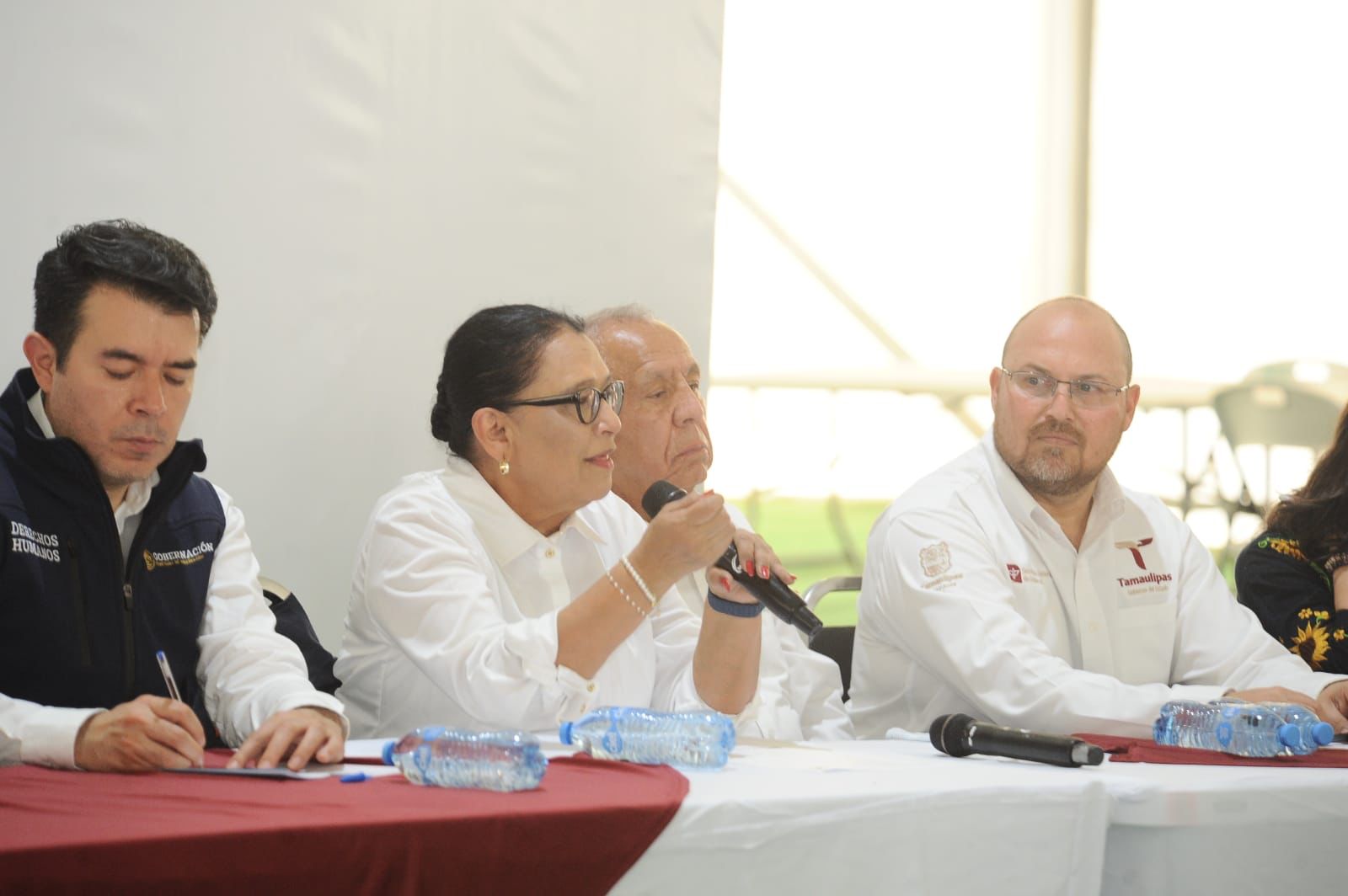 Durante el recorrido, la secretaria de Gobernación estuvo acompañada por Héctor Joel Villegas González, secretario general de Gobierno; la senadora Olga Sosa Ruiz; el senador José Ramón Gómez Leal; la senadora Karina Ruiz; Sergio Salomón Céspedes, ex gobernador de Puebla; Segismundo Doguin Martínez, titular de la oficina del INM en Tamaulipas y el presidente municipal de Reynosa, Carlos Peña Ortiz.