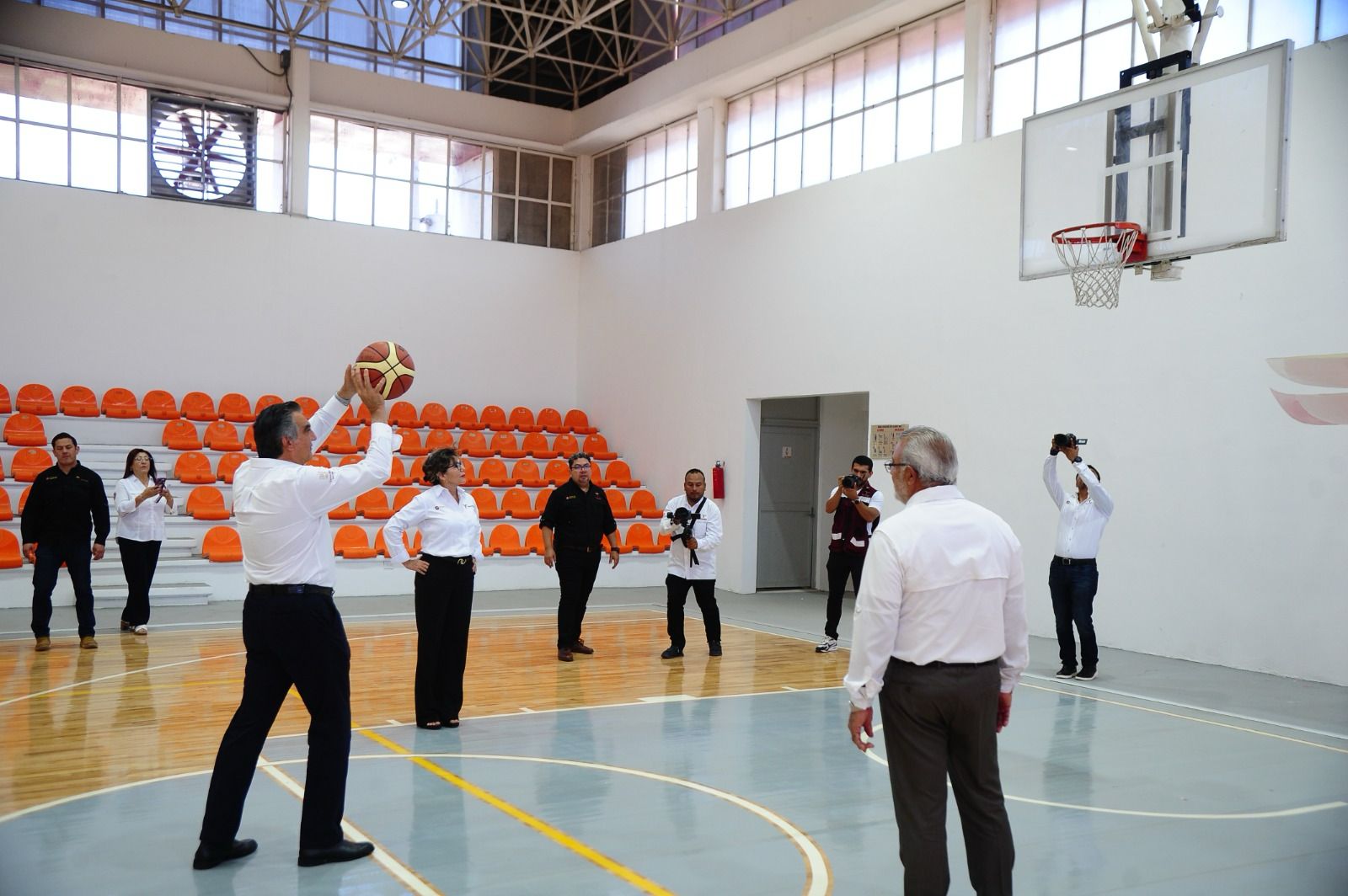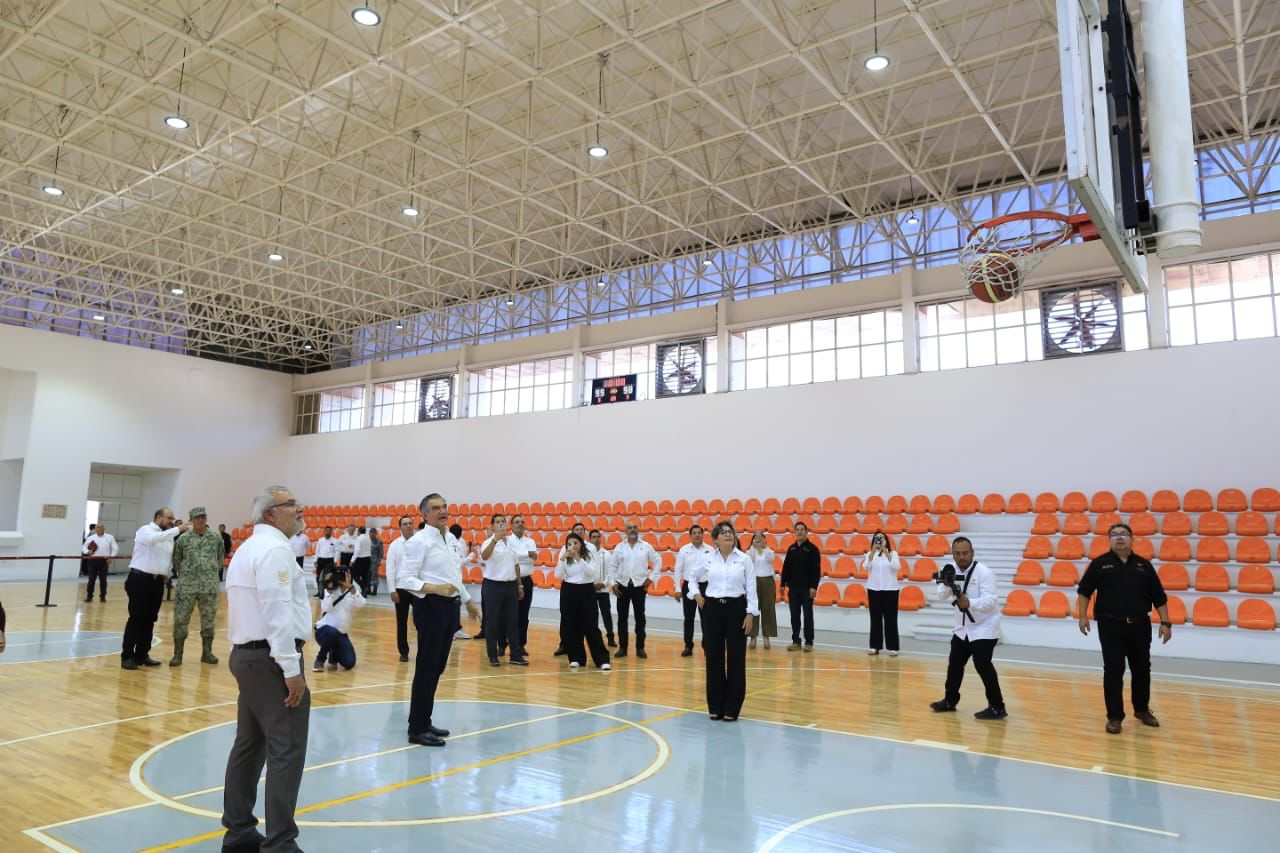 Por su parte, el secretario de Obras Públicas, Pedro Cepeda Anaya, explicó que las canchas de la Unidad Ruiz Cortines cuentan ahora con techumbre, nuevas superficies de juego, iluminación y seguridad eléctrica, además de la instalación de estructura metálica, luminarias y adecuaciones para un uso intensivo del espacio. Mientras tanto, el gimnasio Manuel Raga Navarro cuenta ahora con duela profesional de maple para competencia, nuevos servicios sanitarios, mejoras en ventilación y extracción, así como luminarias renovadas.