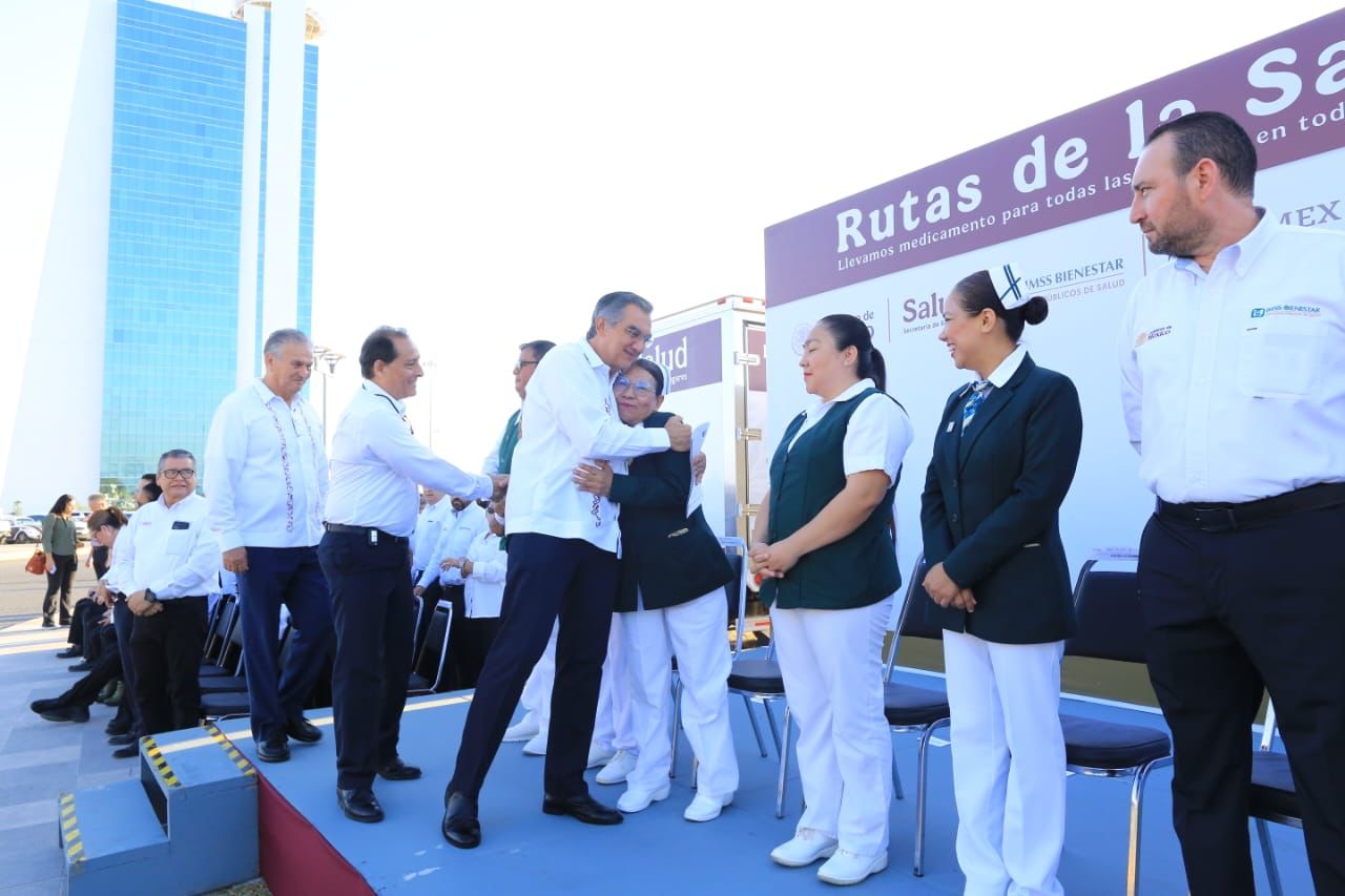 Villarreal Anaya explicó que, con este histórico evento, se ponen en marcha 35 rutas con 15 camiones que transportarán más de 215 mil piezas de medicamentos para su distribución constante y efectiva a 289 centros de salud en el estado.