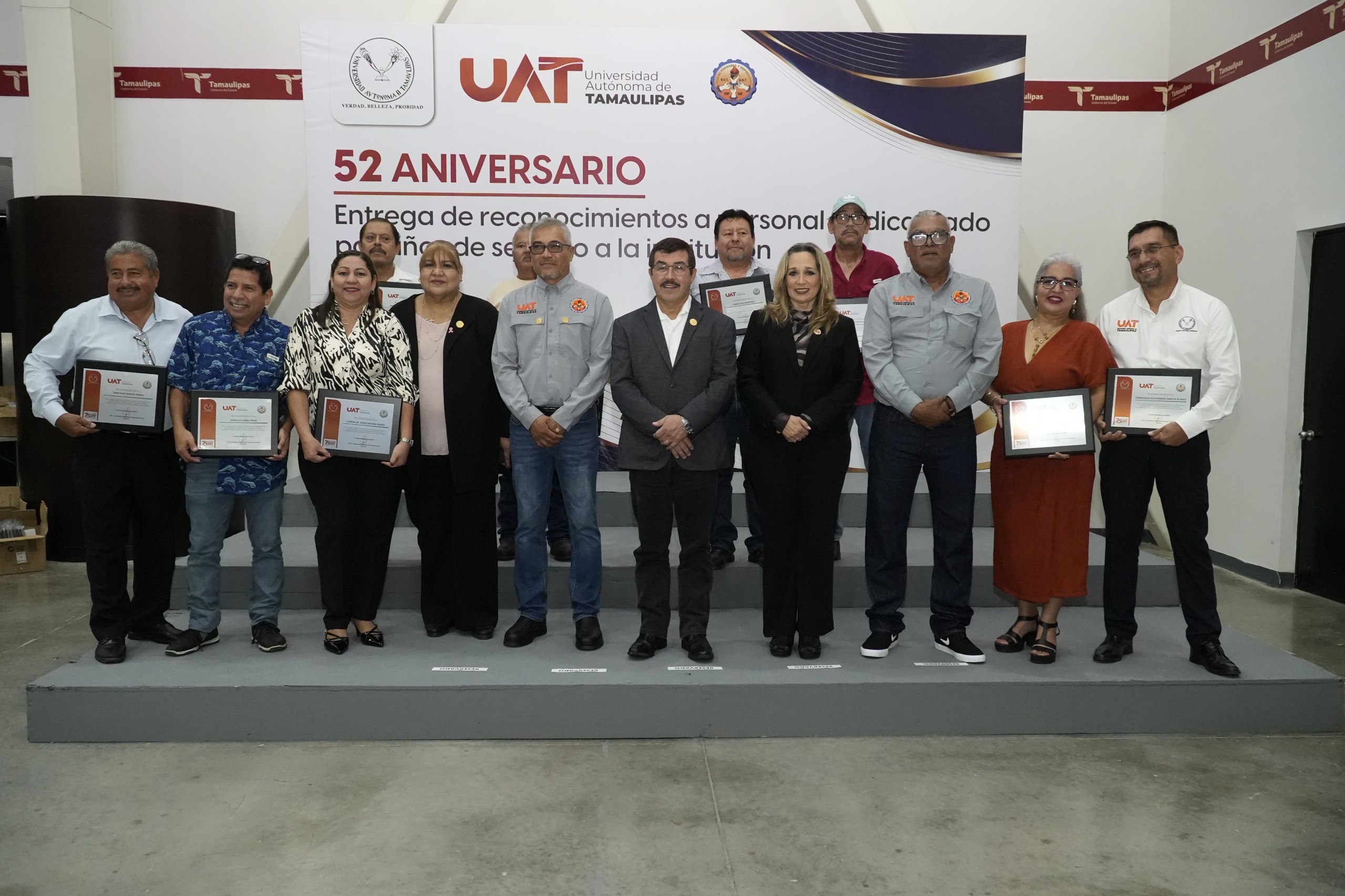 Acompañado de su esposa, la Lic. Isolda Rendón de Anaya, presidenta de Familia UAT, e integrantes de su gabinete, el rector hizo entrega de reconocimientos al personal sindicalizado de las secciones centro, norte, sur y Mante, por su trayectoria de servicio en la institución.