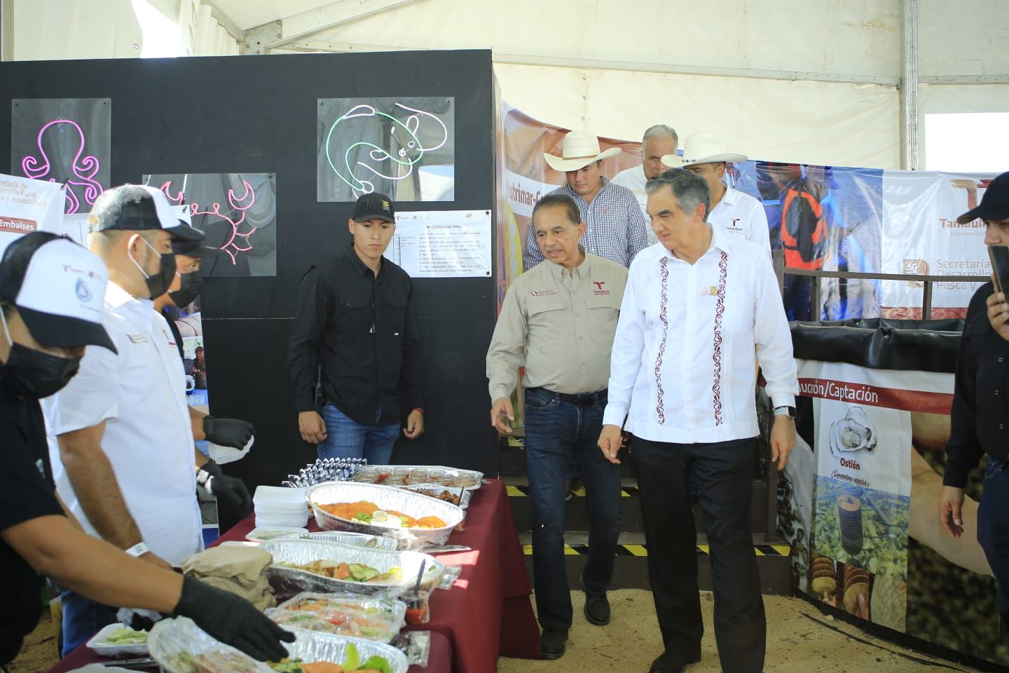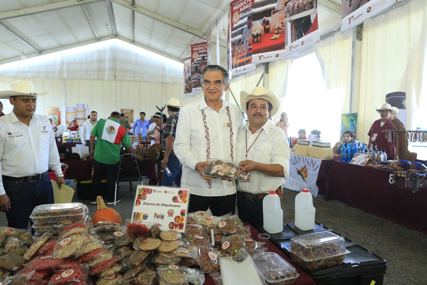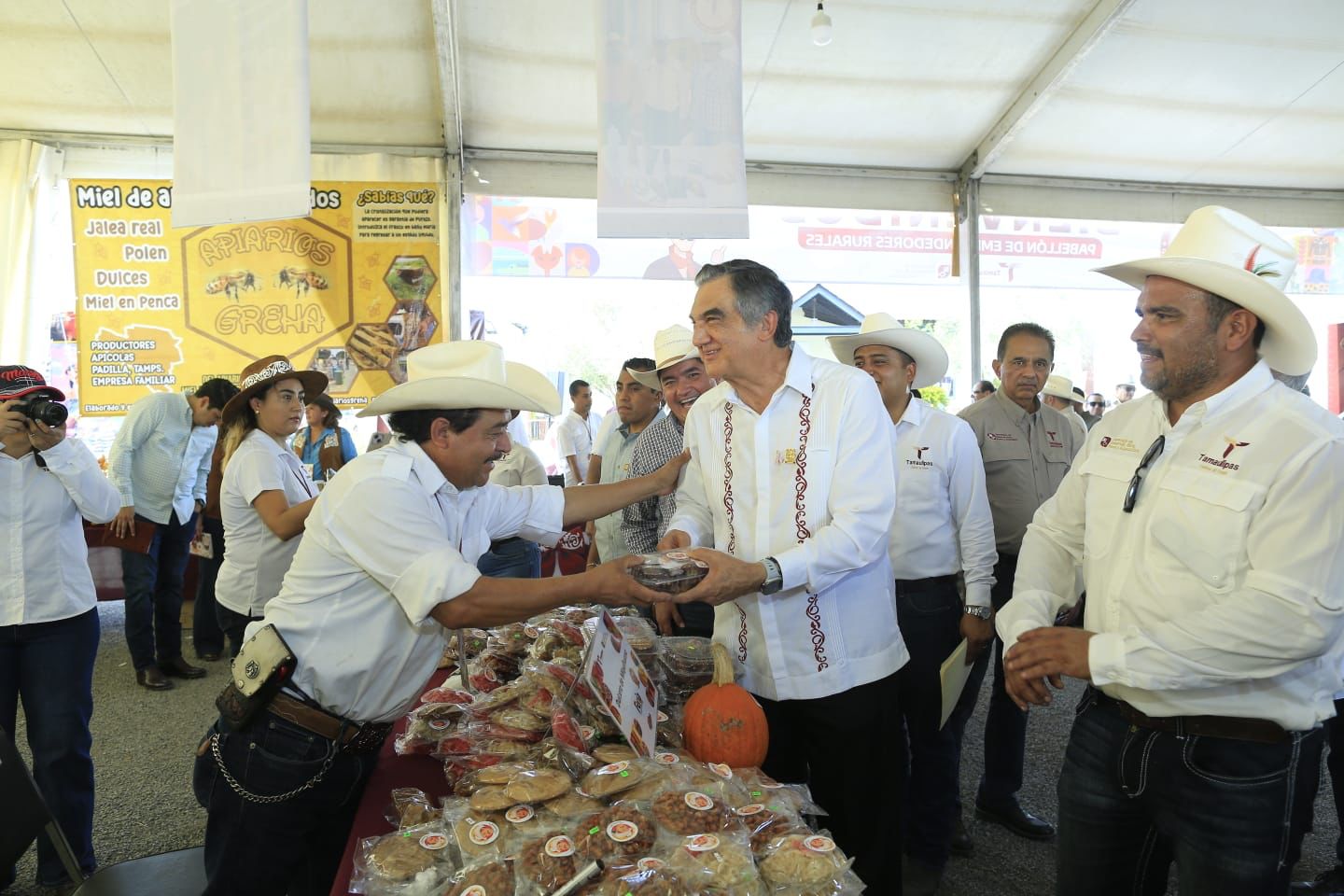 Luego de un amplio recorrido por los “stands” de la Secretaría de Desarrollo Rural, Pesca y Acuacultura, del pabellón de Emprendedores Rurales y tras cortar el listón inaugural del espacio ganadero, el gobernador estuvo presente en la subasta, al final de la cual el presidente de la Unión Ganadera Regional de Tamaulipas, José Ramón Guerrero Gamboa, le entregó la valiosa aportación por parte de las y los ganaderos del estado.