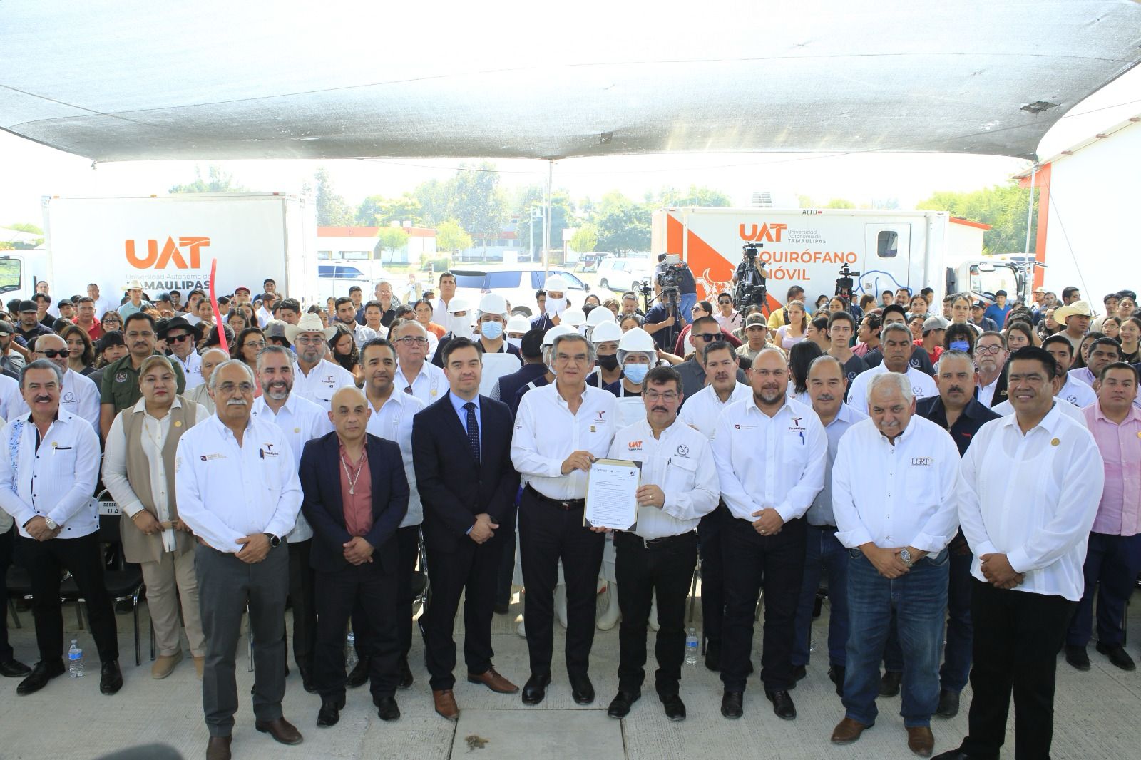 Acompañado por el rector de la UAT, Dámaso Anaya Alvarado, y dirigentes del sector ganadero del estado, el gobernador recibió de manos de Leandro David Soriano García, director general de Inocuidad Agroalimentaria, Acuícola y Pesquera del Senasica, el documento que permite la actividad diaria de la sala de corte y deshuese para la especie bovina, cámara de producto terminado, almacén, empaque y andenes de carga y descarga en el rastro ubicado en la Facultad de Medicina Veterinaria y Zootecnia, en esta capital.