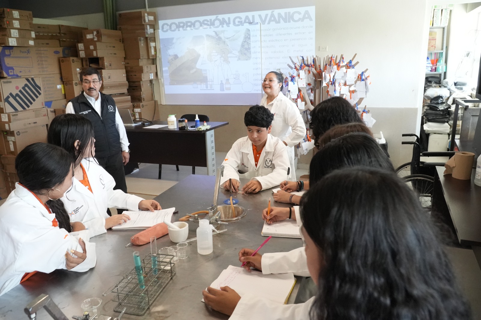 En otro punto del recorrido, sostuvo un diálogo cercano con el personal docente que participa en el curso de homologación de Unidades de Enseñanza-Aprendizaje, quienes compartieron sus experiencias y reflexiones sobre los procesos de enseñanza en el nivel medio superior. Asimismo, visitó las aulas, el laboratorio de ciencias, estands de emprendimiento estudiantil y diferentes espacios del plantel, donde convivió con alumnos destacados, reconociendo su entusiasmo, talento y compromiso con la comunidad universitaria.