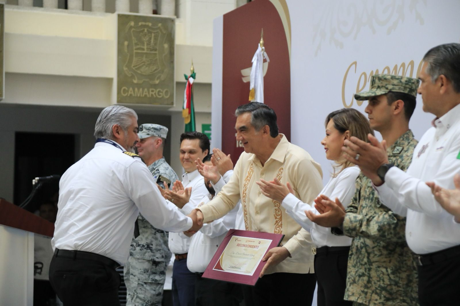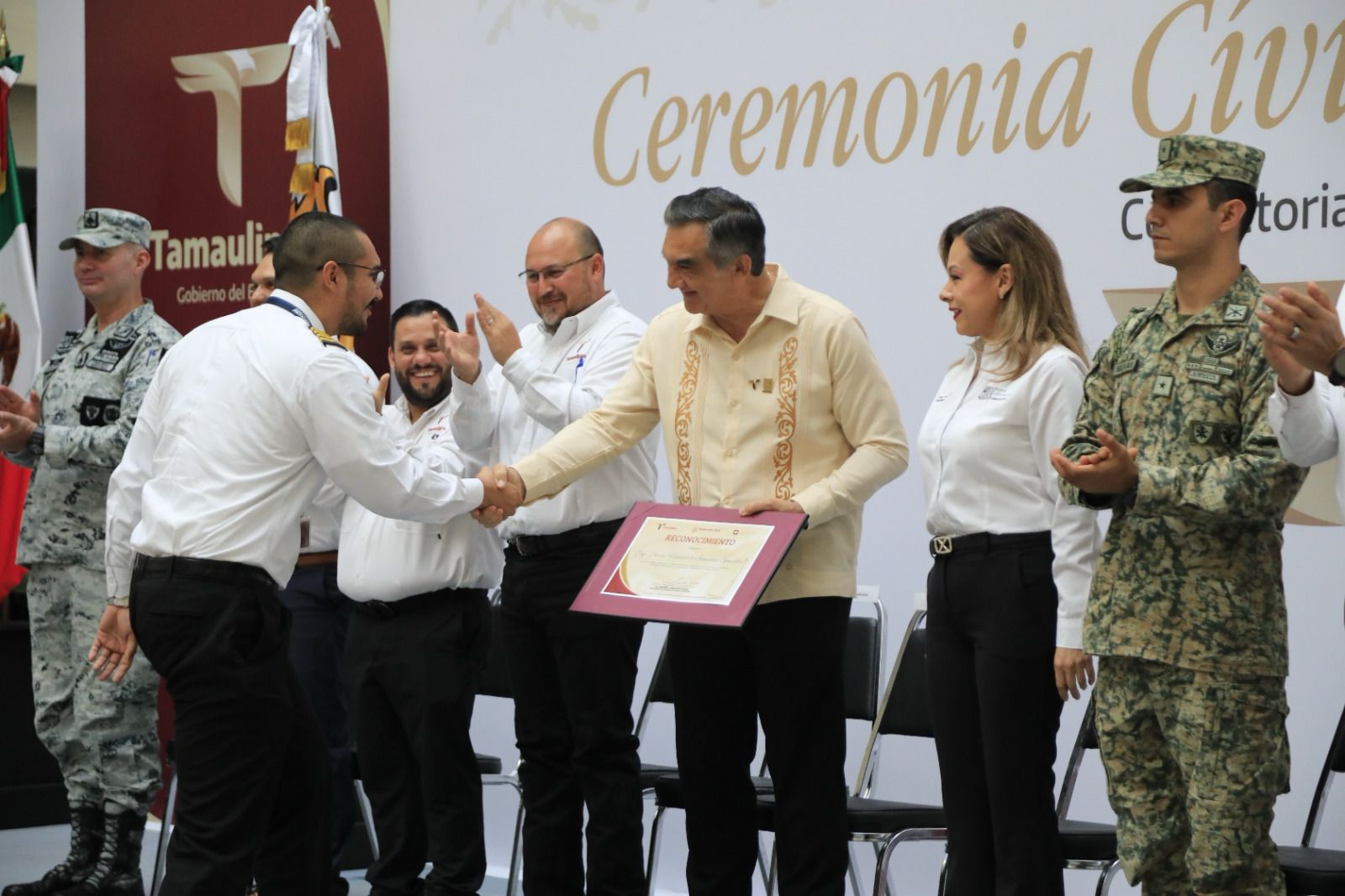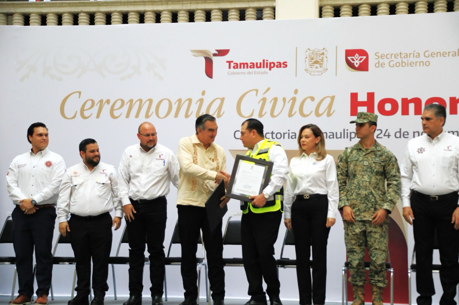 Tras la proyección de un video donde la directora de Protección Civil de Veracruz, Guadalupe Osorno, a nombre de la gobernadora Rocío Nahle da un reconocimiento al pueblo de Tamaulipas, por las labores de auxilio prestadas, el mandatario entregó litografías enviadas por la gobernadora al capitán Marcelo Israel Peña y al técnico auxiliar Fidel Eduardo Castro.