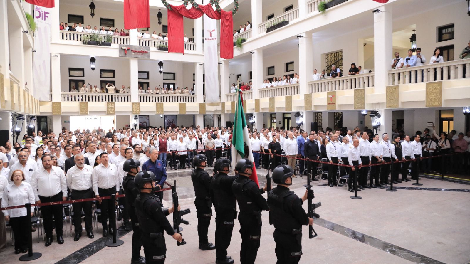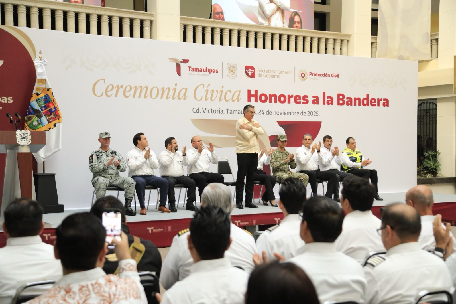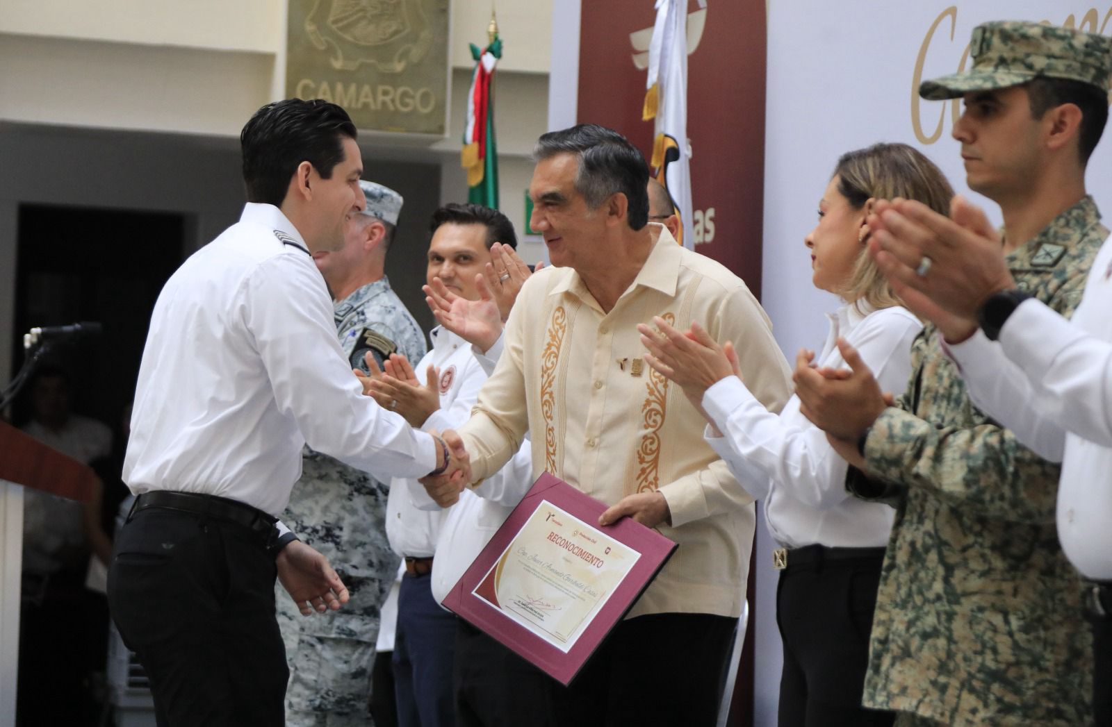 Tras la proyección de un video donde la directora de Protección Civil de Veracruz, Guadalupe Osorno, a nombre de la gobernadora Rocío Nahle da un reconocimiento al pueblo de Tamaulipas, por las labores de auxilio prestadas, el mandatario entregó litografías enviadas por la gobernadora al capitán Marcelo Israel Peña y al técnico auxiliar Fidel Eduardo Castro.