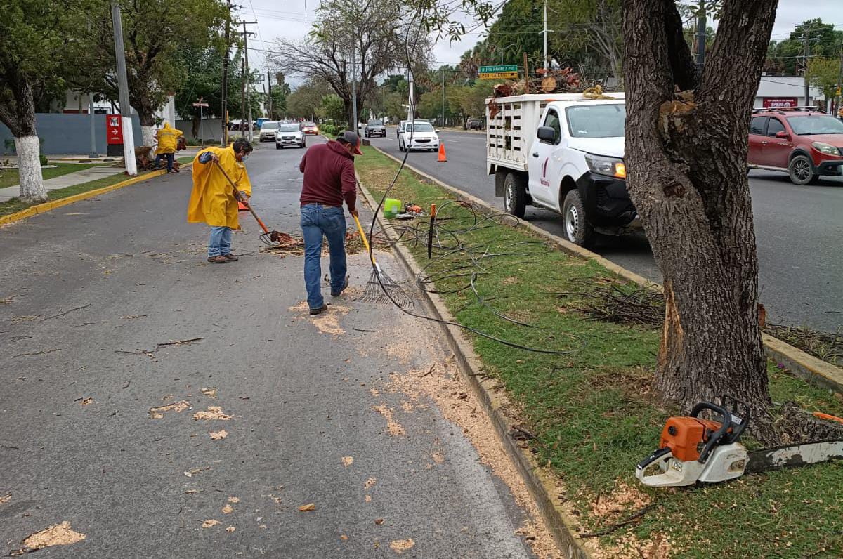 Asimismo, cuadrillas de barrido manual llevaron a cabo labores de limpieza en la calle 8 de la avenida Tamaulipas, retirando ramas para prevenir la obstrucción de drenes pluviales ante la posibilidad de lluvias en las próximas horas.