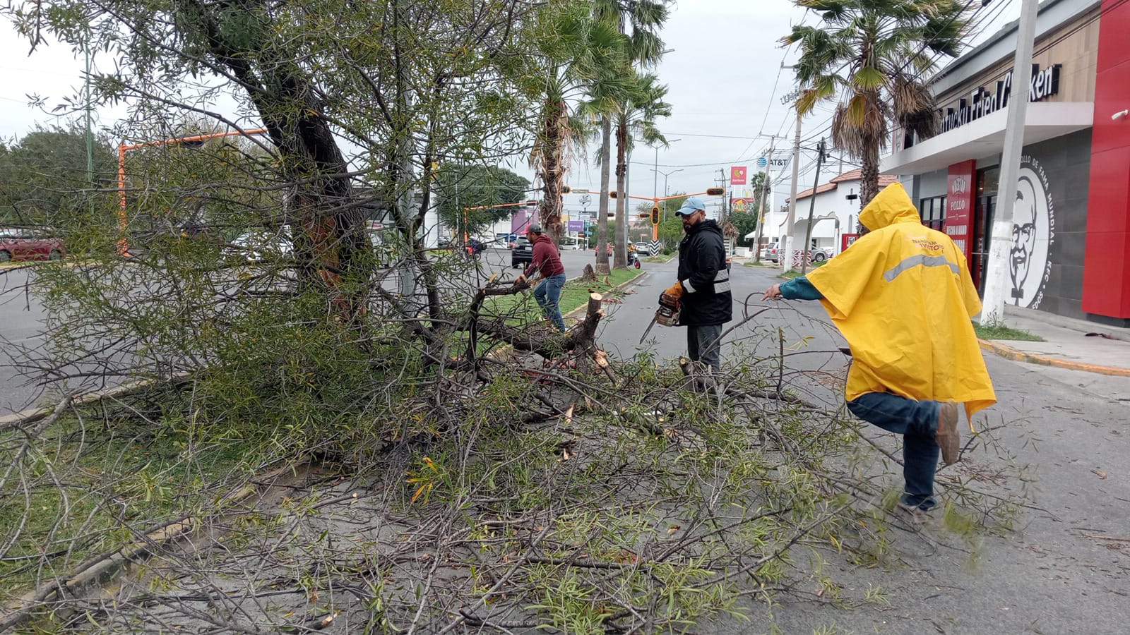 Por instrucción del alcalde Lalo Gattás, se desplegó un operativo en el que participaron elementos de Protección Civil, Parques y Jardines de Servicios Públicos y Desarrollo Urbano, quienes realizaron trabajos de poda y retiro de árboles caídos en puntos como las calles 7 Ceros Hidalgo y Juárez, avenida 24, calle Esmeralda de la colonia Loma Alta, así como en los cruces de 9 y 10 Canales de la colonia Mainero.