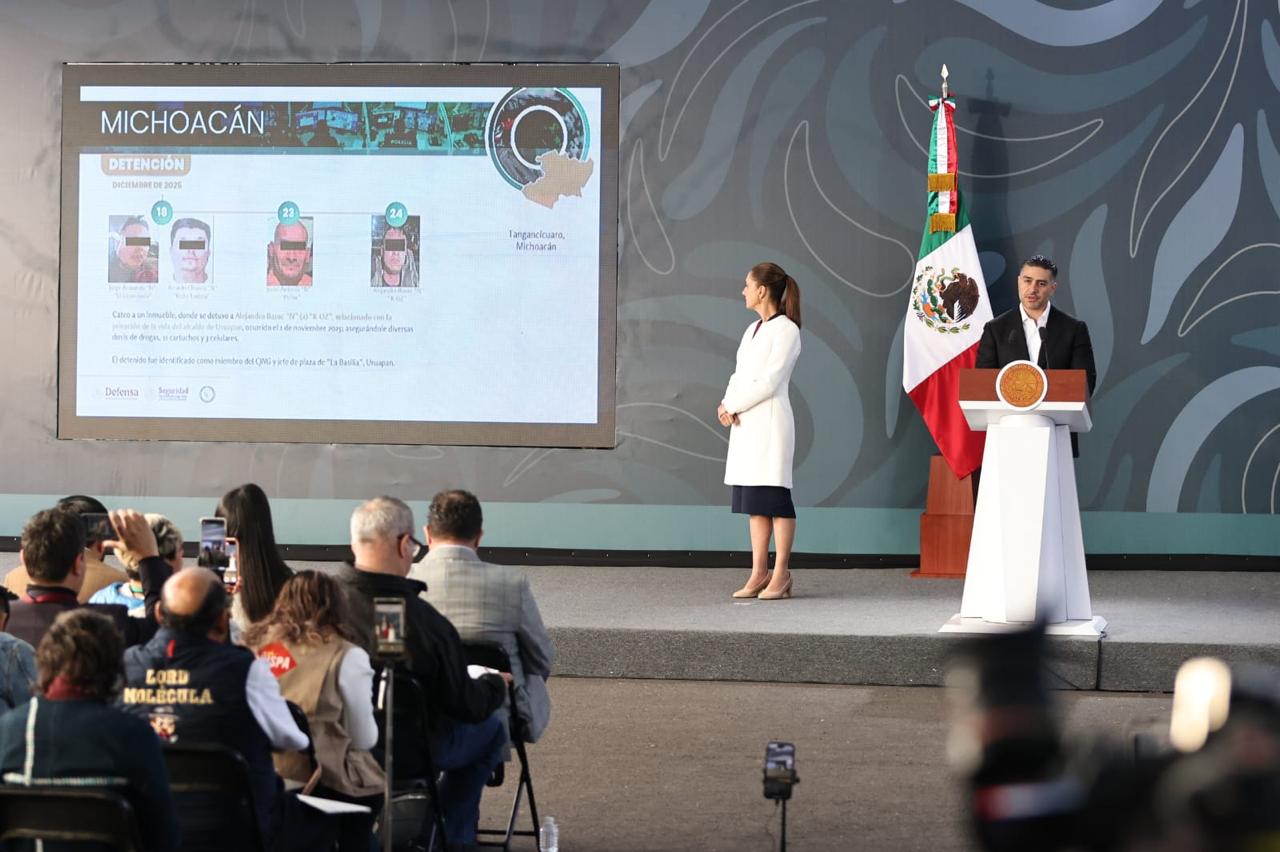 Uno de los puntos clave del informe fue el avance en el caso del homicidio de Carlos Manzo en Uruapan. Harfuch detalló una serie de capturas estratégicas, desde autores intelectuales hasta reclutadores, cerrando con la detención el pasado 24 de diciembre de Alejandro Baruc “N”, alias “K-OZ”, líder de una célula criminal en Parácuaro. Según el secretario, gracias a estos operativos y a los indicios recolectados, «contamos con más información para continuar con las detenciones relacionadas con este caso».