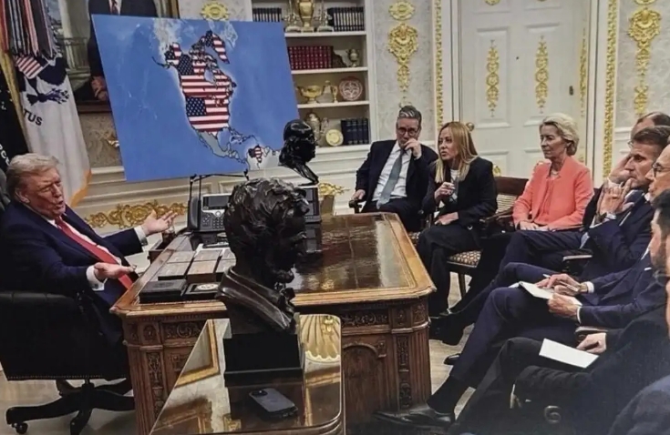 La segunda imagen ha causado un impacto aún mayor debido a su contexto. Se trata de una edición basada en una fotografía real tomada en agosto durante una reunión de alto nivel en el Despacho Oval. En la imagen original, Trump aparece junto a líderes europeos de la talla de Friedrich Merz (Canciller alemán), Giorgia Meloni e incluso el presidente de Ucrania, Volodimir Zelenski.