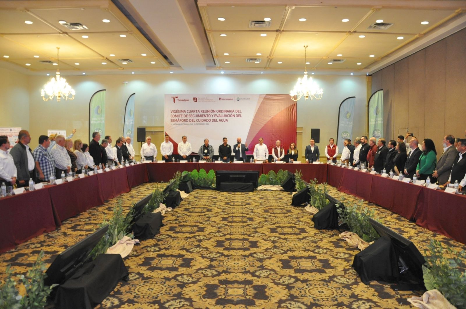 El encuentro contó con la participación del secretario de Desarrollo Urbano y Ecología, Alfonso Treviño Robles, quien asistió en representación del presidente municipal de Matamoros, Alberto Granados Fávila, así como autoridades estatales y municipales, representantes del Poder Legislativo y gerentes de los organismos operadores del agua de Tamaulipas.