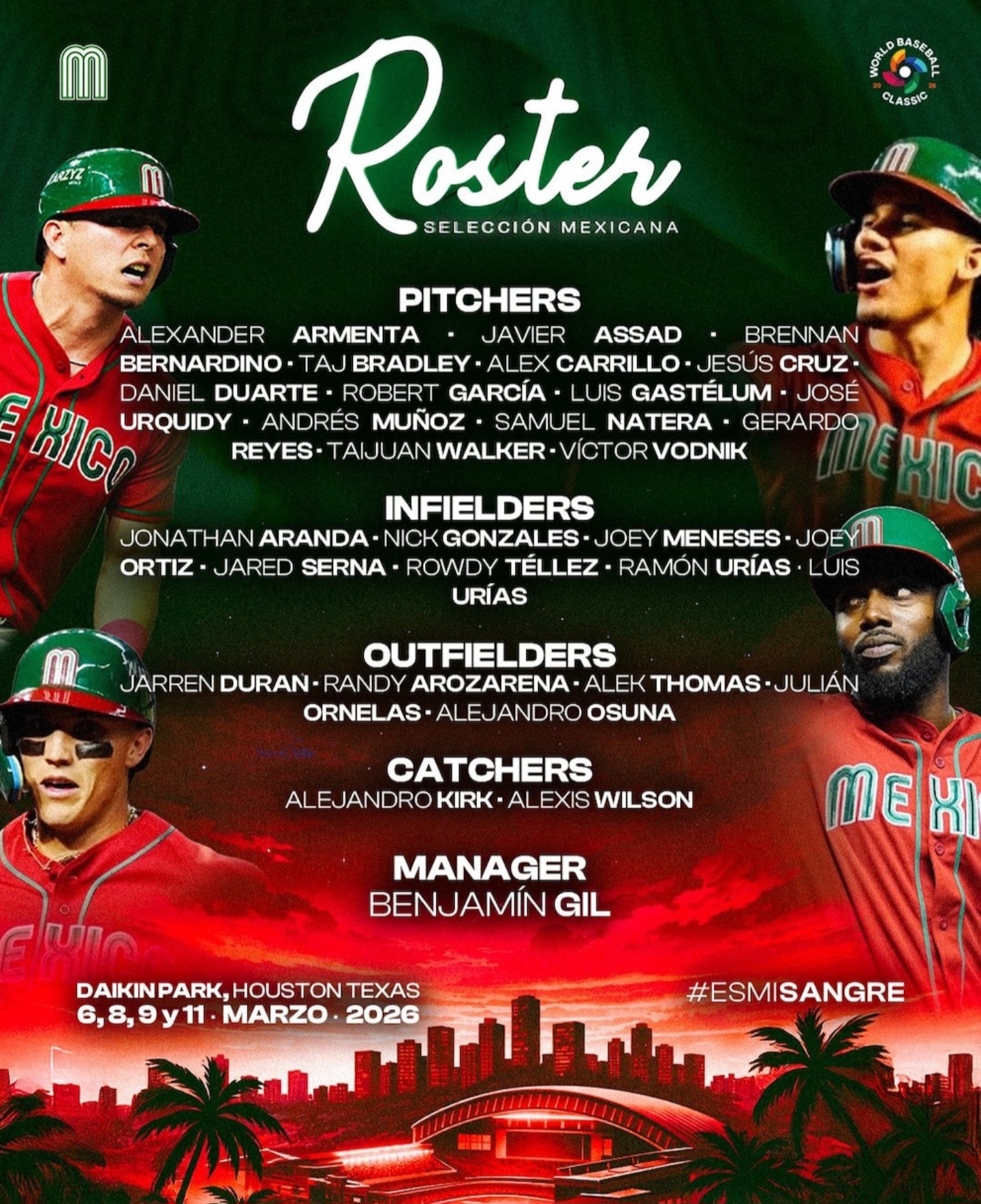 ​Bajo la dirección estratégica de Benjamín Gil, México ha conformado una escuadra que combina poder ofensivo y un pitcheo sólido de Grandes Ligas. Entre los nombres que buscarán la gloria destacan: