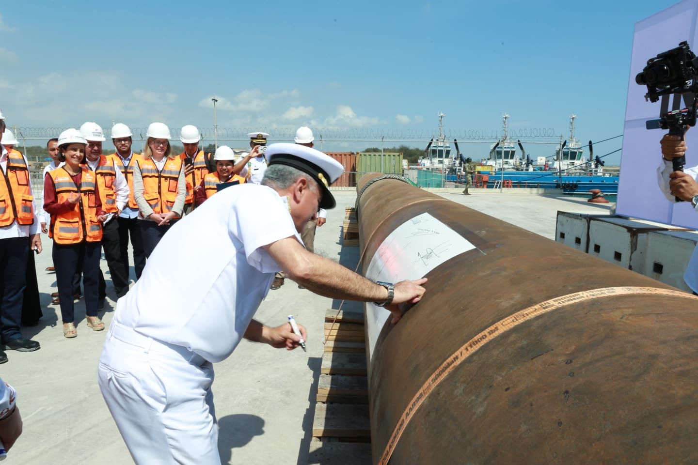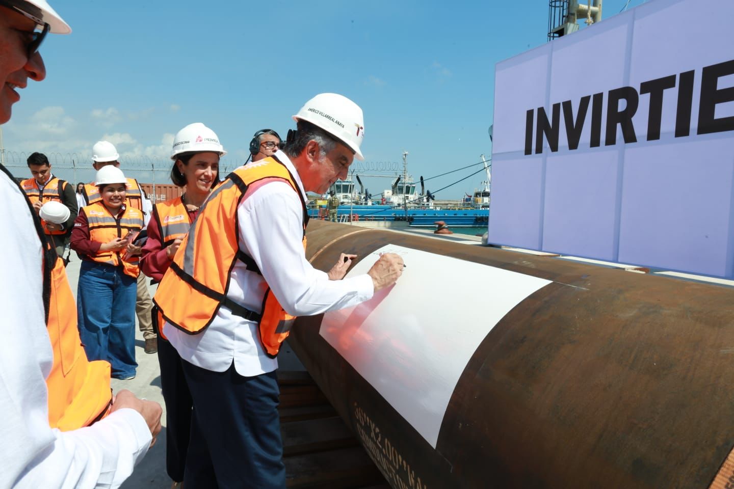 Posterior al evento, el gobernador y las y los invitados se trasladaron al patio de maniobras para realizar la firma de los cabezales de perforación que serán trasladados a la plataforma marítima.
