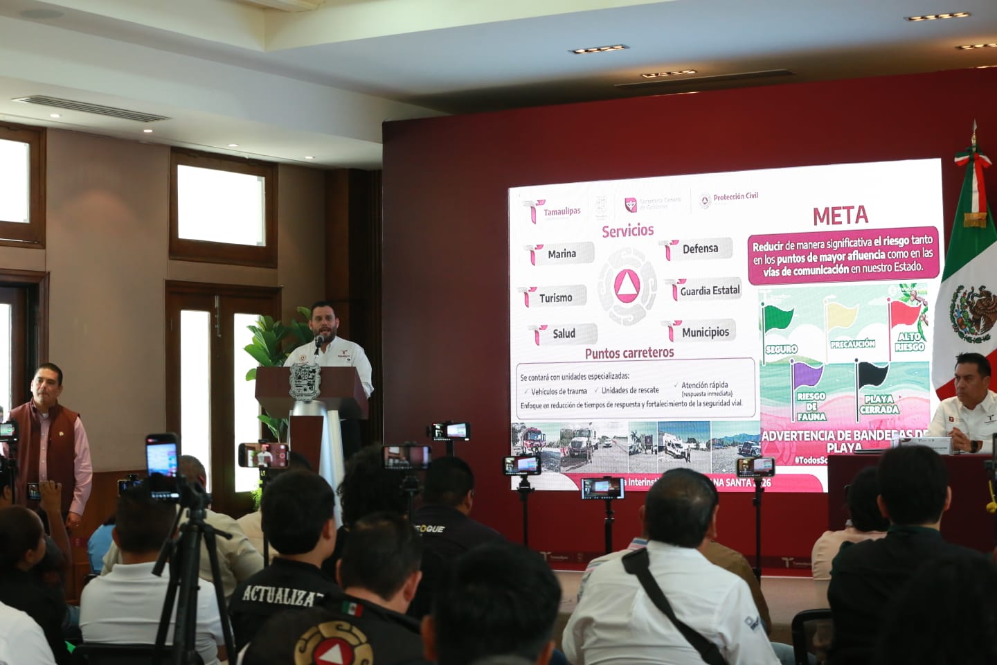Durante la presentación de la Estrategia Interinstitucional de Seguridad y Asistencia Turística, Semana Santa 2026, que estará en operación hasta el próximo 18 de abril, y acompañado por los secretarios de Seguridad Pública, Turismo, el coordinador estatal de Protección Civil y el titular del Centro de Regulación de Urgencias Médicas, el gobernador indicó que se trata de un amplio despliegue que contempla la movilización de elementos, recursos institucionales y distintos equipos para brindar la mejor atención a nuestros visitantes.