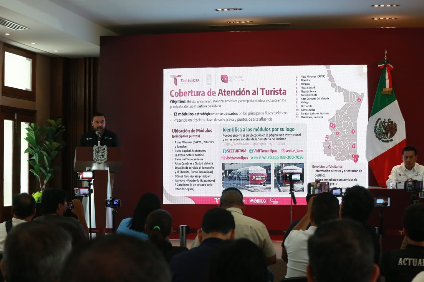 Durante la conferencia de prensa en el Salón Independencia de Palacio de Gobierno, el secretario de Turismo, Benjamín Hernández Rodríguez, explicó que el agrupamiento Ángeles Verdes dará cobertura en 11 rutas estratégicas, con 29 elementos y 19 unidades de operación, brindando asistencia mecánica, información turística, apoyo a emergencias y orientación al turista en los 2,388 kilómetros de la red carretera, y agregó que se cuenta con 12 módulos de atención en puntos estratégicos instalados en los principales flujos turísticos.