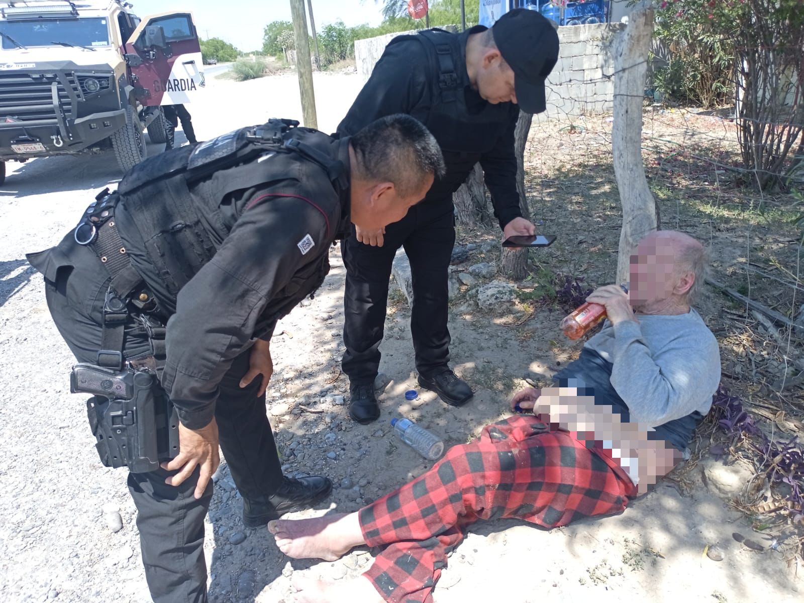 Gustavo Díaz Ordaz, Tamaulipas.- Personal de la Guardia Estatal brindó apoyo a un adulto mayor en aparente estado de abandono, luego de que fuera localizado sobre la vía pública en el poblado Lucio Blanco, tras un reporte ciudadano.