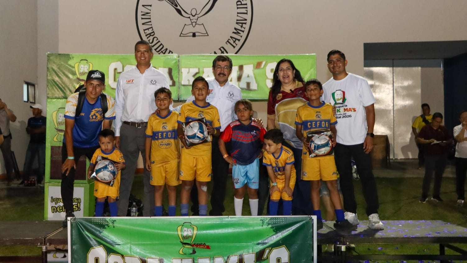 En el marco del fortalecimiento de la vinculación social y el impulso a la formación integral de la niñez y juventud, el rector de la Universidad Autónoma de Tamaulipas (UAT), Dámaso Anaya Alvarado, inauguró la Copa Kama’s de futbol la noche de este viernes 17 de abril en las instalaciones del Gimnasio Multidisciplinario Mante, espacio universitario que fungió como sede del evento.