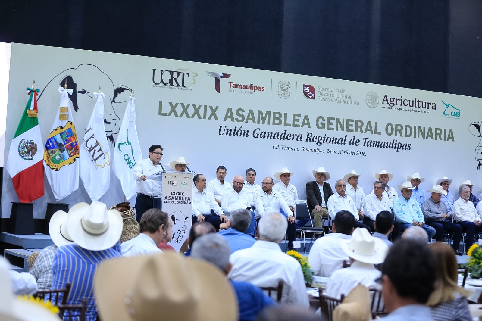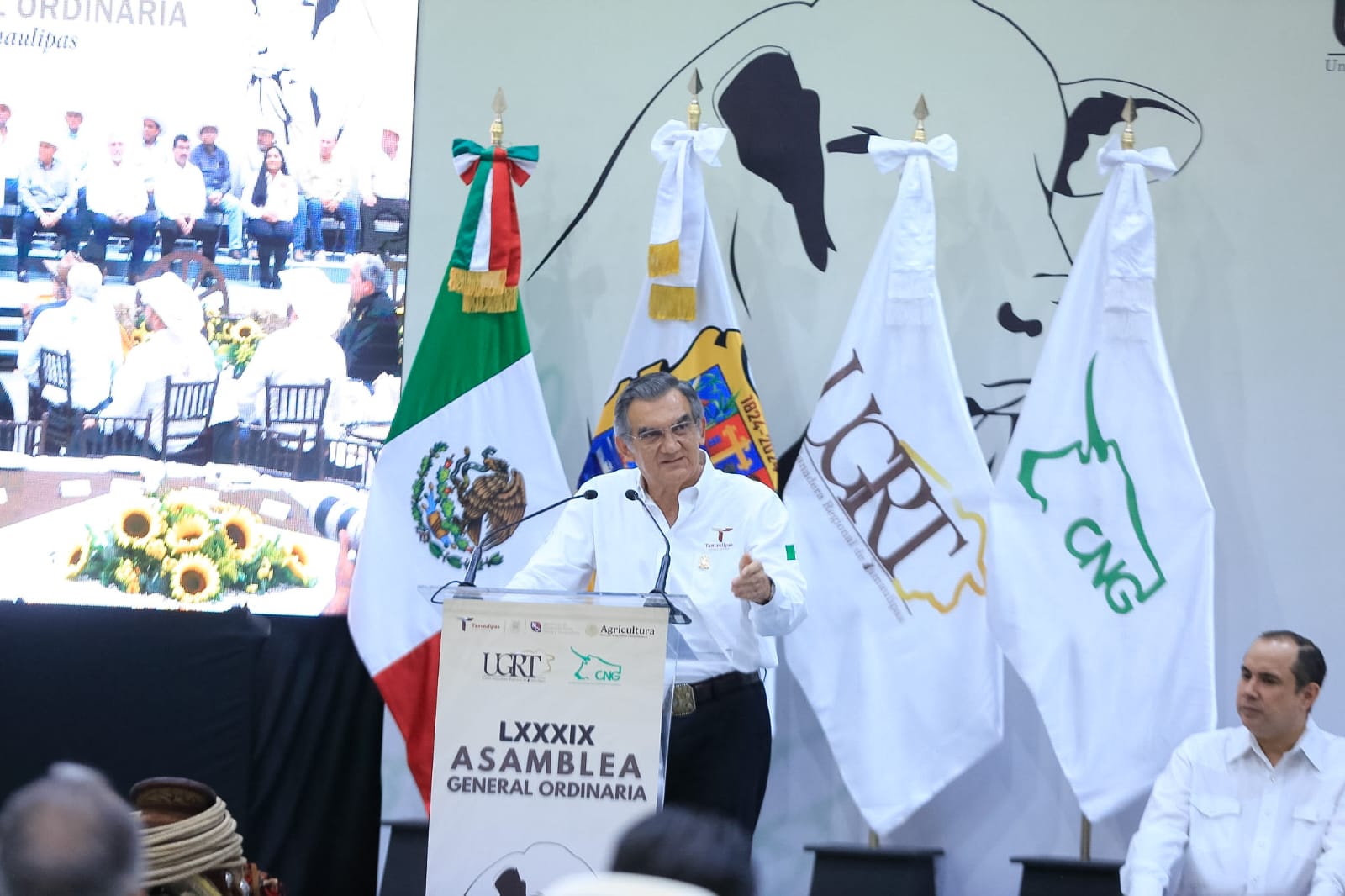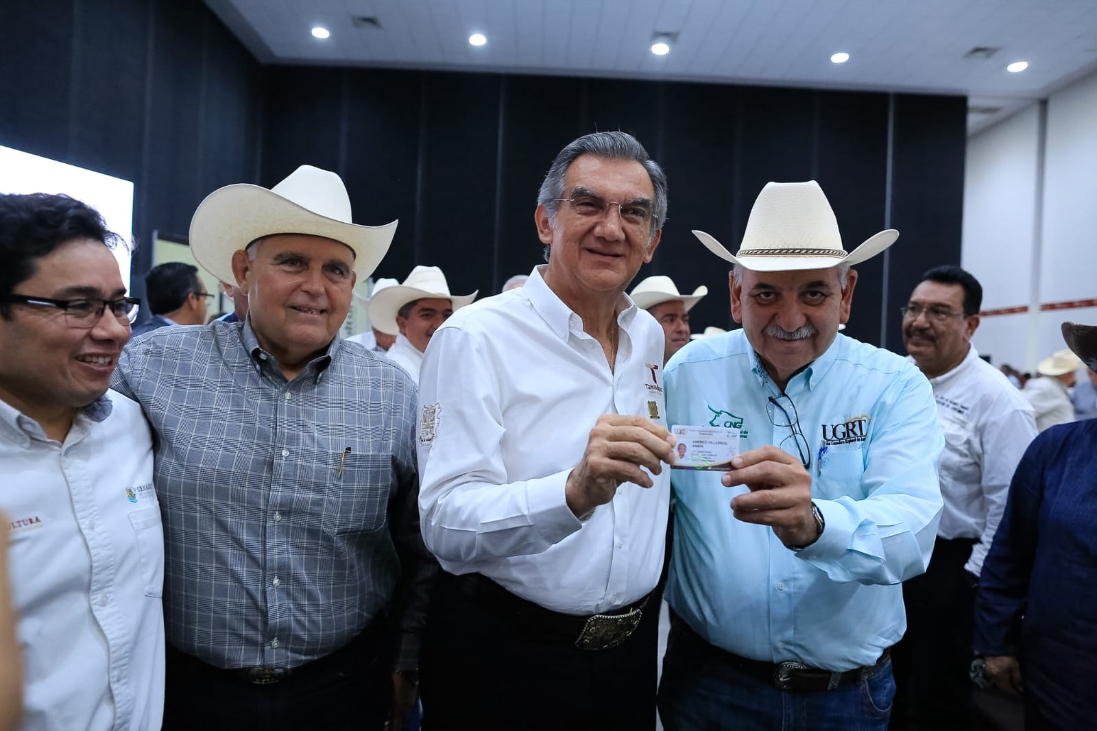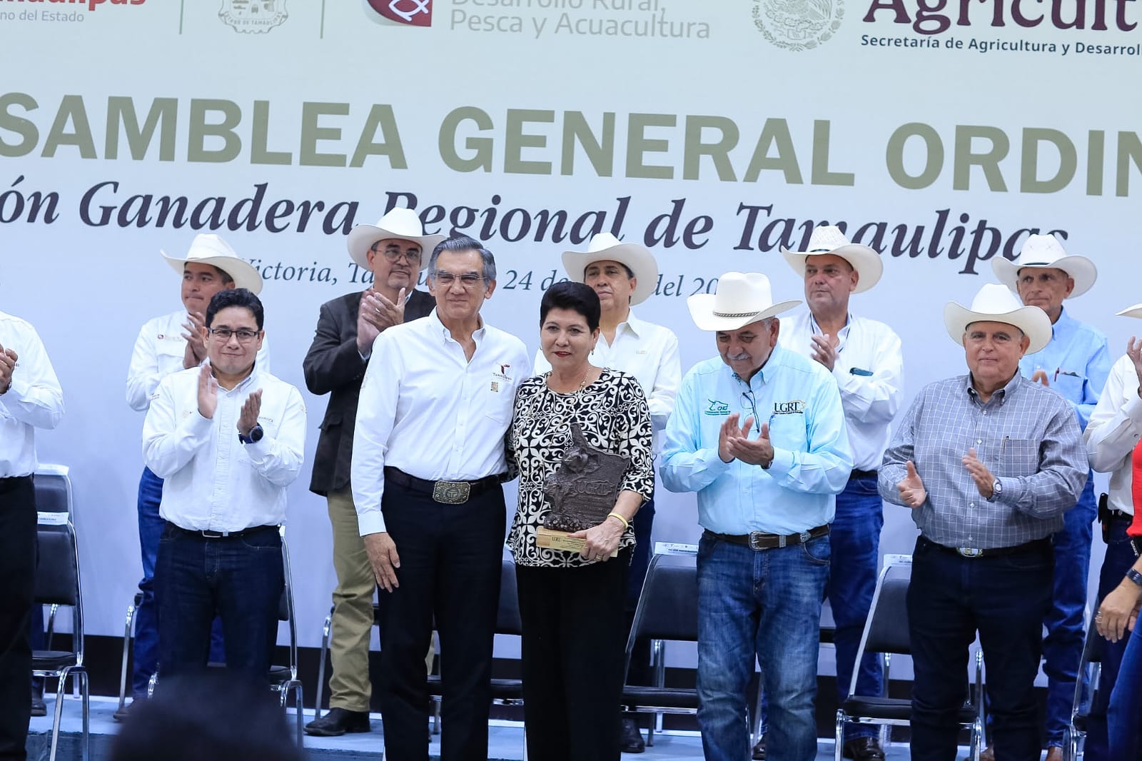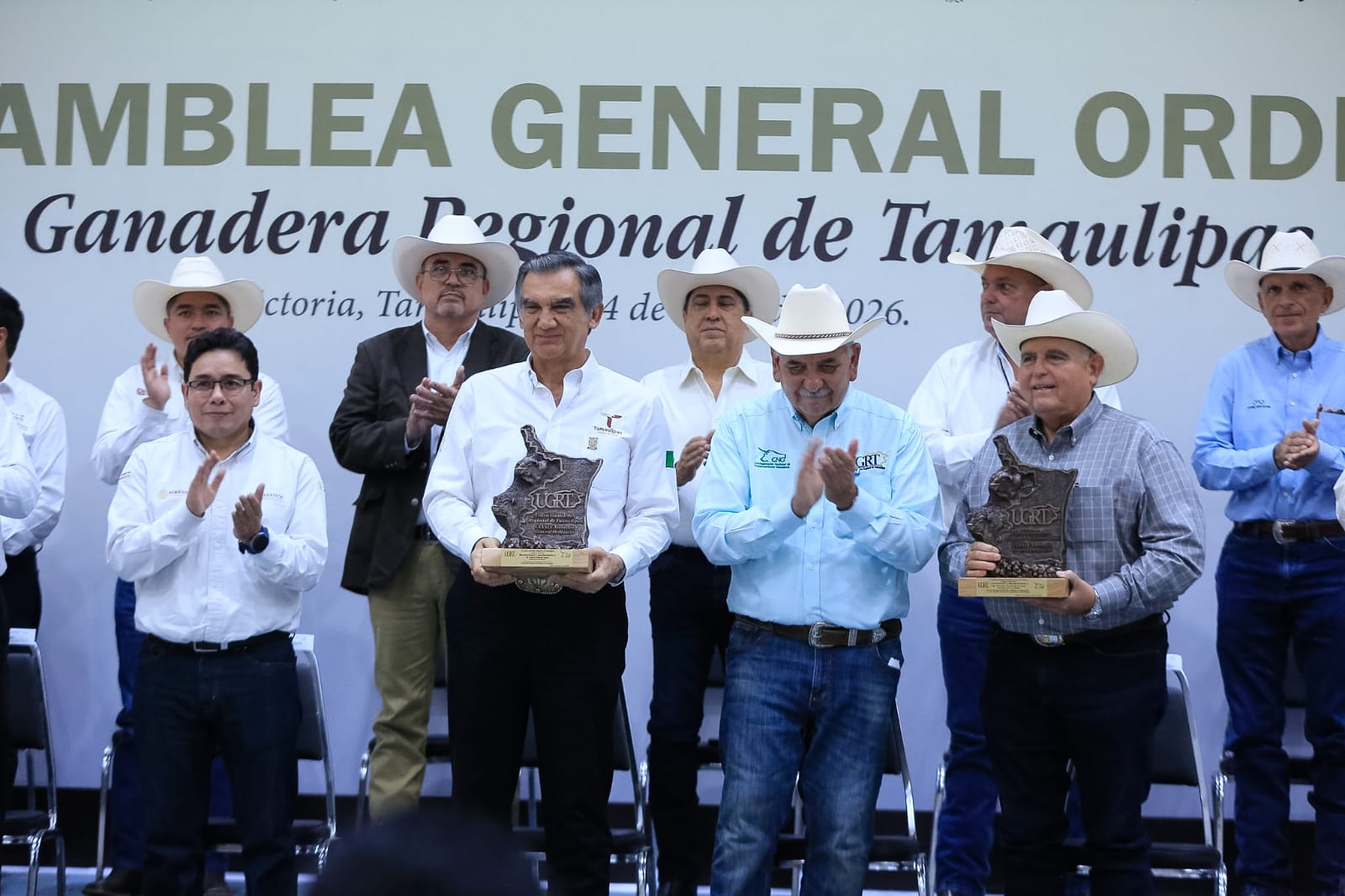 Durante la Asamblea, a la que se dieron cita 54 asociaciones ganaderas locales, así como presidentas y presidentes municipales de Nuevo Laredo, Aldama, Casas, Güémez y González, además de legisladoras y legisladores, funcionarios estatales y todo el Consejo Directivo de la UGRT, el gobernador entregó el reconocimiento al Mérito Ganadero a Eulalio Guerra Guerra, de Reynosa; María Elvira Pérez Pérez, de Abasolo, y a don Héctor Osvaldo Barberena Aguirre, de Nuevo Laredo.